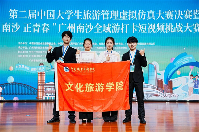 中新河南網(wǎng)5月22日電(張沈玄)5月15日至19日,第二屆中國(guó)大學(xué)生旅游管理虛擬仿真大賽決賽在廣東舉行。經(jīng)激烈角逐,河南職業(yè)技術(shù)學(xué)院文化旅游學(xué)院李金明、郭騰達(dá)、劉雯迪和晁晨晨等4位同學(xué)組成的參賽隊(duì)脫穎而出,榮獲大賽一等獎(jiǎng);趙翔獲“優(yōu)秀指導(dǎo)教師”稱號(hào)。
