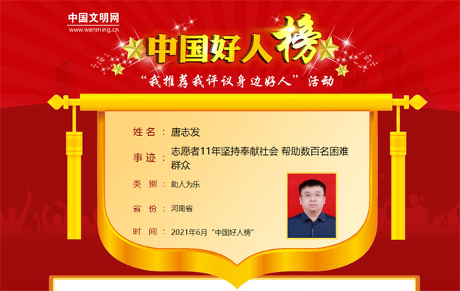 2021年6月,唐志發(fā)榮登中國好人榜