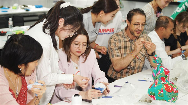 6日下午,校長(zhǎng)夏新顏、副校長(zhǎng)魯冬出席了國(guó)際教育學(xué)院舉辦的“粽香四溢,非遺端午”中國(guó)文化交流活動(dòng)。夏新顏向外教和留學(xué)生送上了節(jié)日的祝福和親切的問(wèn)候,并詳細(xì)介紹了端午節(jié)在中國(guó)傳統(tǒng)文化中的重要地位。她指出,端午節(jié)是中國(guó)的重要傳統(tǒng)節(jié)日,是承載著深厚文化意義和民族情感的文化符號(hào),希望通過(guò)此次活動(dòng),全體外教和留學(xué)生能夠更加深入了解中國(guó)文化,深切感受中國(guó)非物質(zhì)文化遺產(chǎn)的魅力。隨后,留學(xué)生們現(xiàn)場(chǎng)分享了對(duì)端午節(jié)的相關(guān)認(rèn)識(shí),并在相關(guān)師生的指導(dǎo)下包粽子、做扎染香包,體驗(yàn)中國(guó)傳統(tǒng)技藝樂(lè)趣,感受中國(guó)優(yōu)秀傳統(tǒng)文化魅力。