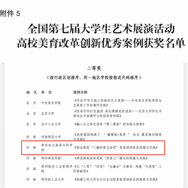 近年來(lái),鄭州電力高等專(zhuān)科學(xué)校高度重視美育工作,堅(jiān)持以社會(huì)主義核心價(jià)值觀為引領(lǐng),充分發(fā)揮美育在文化育人、實(shí)踐育人中的功能,著力構(gòu)建以藝術(shù)課程為主體、藝術(shù)活動(dòng)為抓手、藝術(shù)展演為支撐,打造標(biāo)準(zhǔn)化、多樣化、成果化、常態(tài)化的美育工作體系,實(shí)現(xiàn)了激發(fā)美育精神與人才培養(yǎng)的相融相促,學(xué)科特色與藝術(shù)創(chuàng)作的交相輝映。