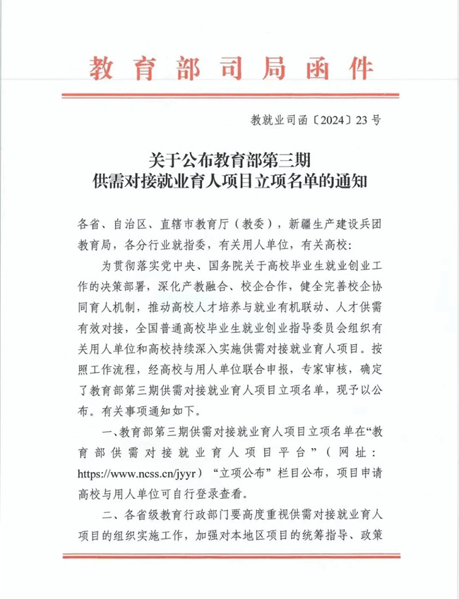 供需對(duì)接就業(yè)育人項(xiàng)目由教育部搭建平臺(tái),面向各類企業(yè)、事業(yè)單位和行業(yè)協(xié)會(huì)征集項(xiàng)目指南,組織高校與發(fā)布項(xiàng)目指南的用人單位開(kāi)展供需對(duì)接。用人單位與高校通過(guò)人才培養(yǎng)、就業(yè)實(shí)習(xí)等方面的合作,推動(dòng)就業(yè)與培養(yǎng)有機(jī)聯(lián)動(dòng)、人才供需有效對(duì)接,幫助用人單位培養(yǎng)和招聘更多實(shí)用型、復(fù)合型和緊缺型人才,促進(jìn)高校畢業(yè)生更加充分更高質(zhì)量就業(yè)。