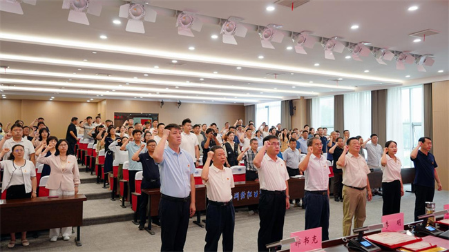 在雄壯的國歌聲中,表彰大會拉開帷幕。隨后,面對鮮紅的黨旗,在張樹嶺的領(lǐng)誓下,全體參會黨員聲音鏗鏘、神情莊重地重溫入黨誓詞,回顧對黨和人民的承諾,堅定黨的信仰和追求。