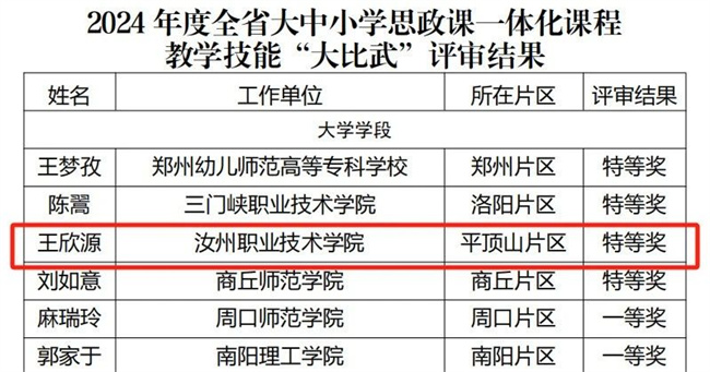 中新河南網(wǎng)7月12日電 近日,全省大中小學(xué)思政課一體化課程教學(xué)技能“大比武”落幕,經(jīng)過激烈角逐,汝州職業(yè)技術(shù)學(xué)院思政部教師王欣源在此次比賽中脫穎而出,榮獲大學(xué)學(xué)段特等獎,所在團隊榮獲二等獎,實現(xiàn)學(xué)院在省級教學(xué)技能比賽的歷史性突破。