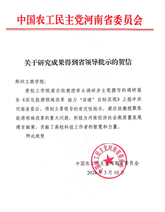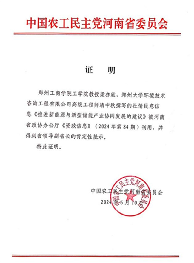 中新河南網(wǎng)7月22日電(梁亦欣) 近日,鄭州工商學(xué)院收到農(nóng)工黨河南省委會發(fā)來的賀信和證明,由該校工學(xué)院梁亦欣教授牽頭調(diào)研并主筆撰寫的調(diào)研報(bào)告《深化能源領(lǐng)域改革助力“雙碳”目標(biāo)實(shí)現(xiàn)》上報(bào)中共河南省委后,得到主要領(lǐng)導(dǎo)的肯定性批示;其主筆撰寫的《推進(jìn)新能源與新型儲能產(chǎn)業(yè)協(xié)同發(fā)展的建議》被河南省政協(xié)辦公廳《資政信息》(2024年第84期)刊用,并得到省領(lǐng)導(dǎo)的肯定性批示。