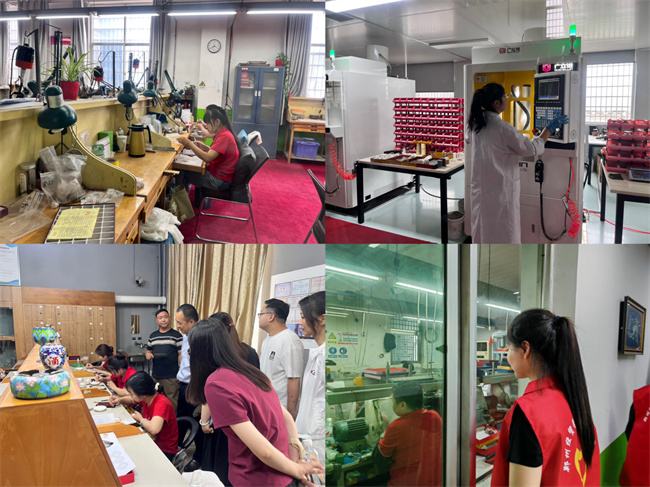7月9日,實(shí)踐團(tuán)一行順利到達(dá)夢祥銀創(chuàng)小鎮(zhèn),實(shí)踐團(tuán)一同參觀集展覽、教育、研究為一體,跨越古今,涵蓋中外的夢祥銀宮博物館,館內(nèi)共有6個展廳,現(xiàn)有藏品上千件,收藏展覽了歷代中國銀飾、銀器代表之作。實(shí)踐團(tuán)跟隨講解員的步伐,走進(jìn)博物館內(nèi),欣賞著精美細(xì)致的紋飾和質(zhì)樸無華的色彩,感受著銀器制作高超的工藝及厚重的歷史沉淀感,聆聽藏品背后的故事,深入了解白銀發(fā)展史,領(lǐng)略非遺文化。為近距離了解到銀產(chǎn)品生產(chǎn)工藝,實(shí)踐團(tuán)走進(jìn)白銀智能車間,深度參觀夢祥產(chǎn)品生產(chǎn)過程。“一錘一鏨一匠心 一師一界一乾坤”,在銀飾制作車間,實(shí)踐團(tuán)目睹了工匠們精湛的技藝,銀器鏨刻工藝展現(xiàn)出的細(xì)膩紋理、掐絲工藝的精巧細(xì)致、點(diǎn)藍(lán)工藝的色彩變幻、琺瑯工藝的精美絕倫,都令團(tuán)隊成員贊嘆不已。但精美的背后卻是手指磨破皮,磨出厚厚的繭。一位在這里工作了十幾年的師傅說:“沒有層層老繭,怎能鍛打出紋路、肌理、質(zhì)感可見的器物?看著經(jīng)自己手打造出來的新飾品,內(nèi)心會覺得很滿足。”此刻此景,實(shí)踐團(tuán)成員深深感受到了“守”藝人身上精益求精的工作態(tài)度和大國工匠精神。隨后,實(shí)踐團(tuán)參觀了夢祥黨建室,深入了解了夢祥公司發(fā)展歷程中蘊(yùn)含的紅色文化,充分領(lǐng)悟了黨組織在企業(yè)創(chuàng)業(yè)發(fā)展歷程中的引領(lǐng)作用。