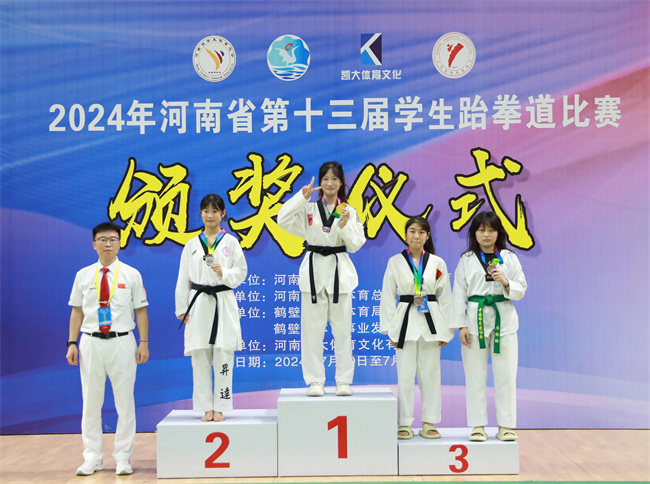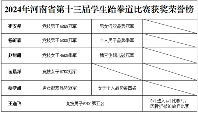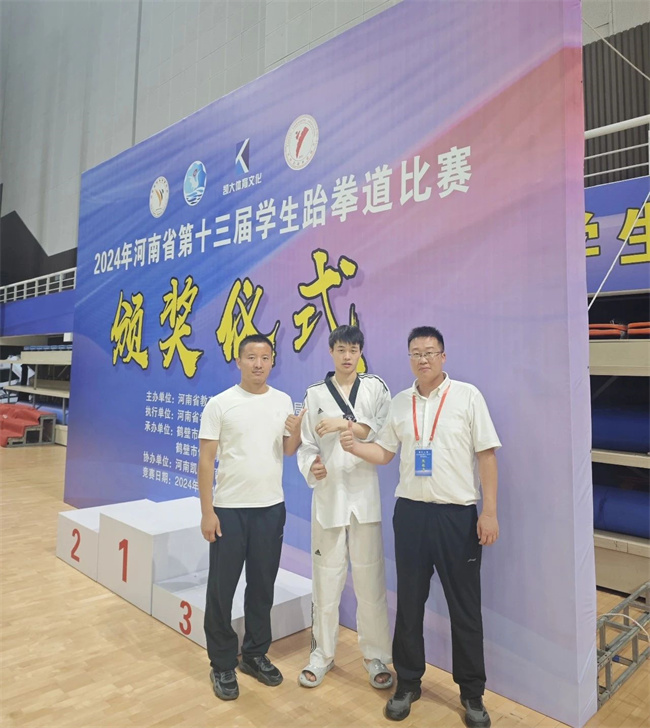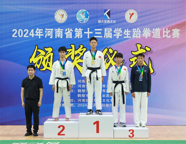 汝州職院跆拳道代表隊(duì)由陳寶利任領(lǐng)隊(duì),胡鵬、王鵬飛任教練員,6名參賽運(yùn)動(dòng)員主要參加了競技、品勢和擊破三個(gè)項(xiàng)目的角逐。其中,崔安邦榮獲競技男子68KG冠軍、男女混雙品勢冠軍;楊沂霖榮獲競技男子58KG冠軍、個(gè)人男子品勢季軍;趙甜甜榮獲騰空側(cè)踢擊破冠軍、競技女子46KG季軍;凌晨洋榮獲競技女子67KG冠軍;蔡夢(mèng)妍榮獲男女混雙品勢冠軍、女子個(gè)人品勢第四名;王逸飛榮獲競技男子63KG第五名。此外,王逸飛同學(xué)被評(píng)為優(yōu)秀運(yùn)動(dòng)員,胡鵬老師被評(píng)為優(yōu)秀指導(dǎo)教師。