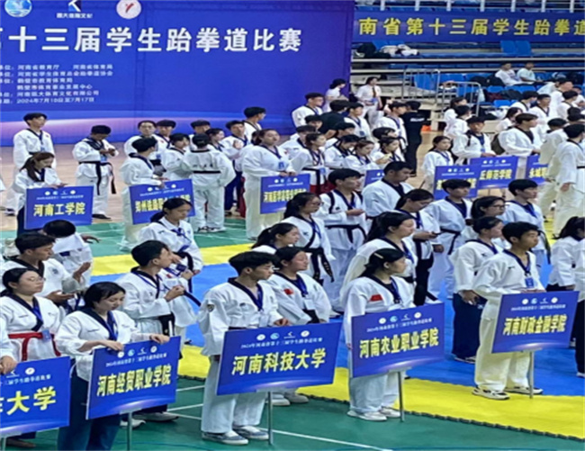 中新河南網(wǎng)7月28日電(尚華)7月13日至17日,河南省第十三屆學(xué)生跆拳道比賽在鶴壁市千鶴之舞體育館舉行,本次比賽由河南省教育廳、河南省體育局聯(lián)合主辦,共有來(lái)自河南省63所高校749名教練員、運(yùn)動(dòng)員參賽。河南農(nóng)業(yè)職業(yè)學(xué)院公共體育學(xué)院派出由7名同學(xué)組成的代表隊(duì),參加?萍捉M的激烈角逐,此次比賽由公共體育學(xué)院黨支部書(shū)記婁會(huì)俊擔(dān)任領(lǐng)隊(duì),何磊、姚利娟老師擔(dān)任教練員。