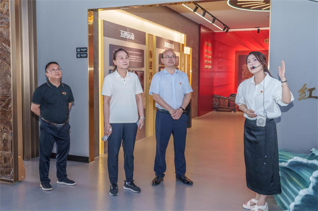 在該校黨建與思政教育基地,調研組一行跟隨講解員的腳步,參觀了“開天辟地”“改天換地”“翻天覆地”“驚天動地”等展區(qū),重溫了中國共產(chǎn)黨百年來為人民謀幸福、為民族謀復興的奮斗歷程,并和學校領導就大思政課建設方面展開了深入的交流。