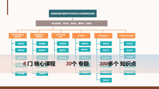 濟(jì)源職業(yè)技術(shù)學(xué)院組建了由中文、歷史、美術(shù)、音樂、旅游、設(shè)計(jì)等13個學(xué)科背景的教師團(tuán)隊(duì),結(jié)合學(xué)情實(shí)際,立足職業(yè)發(fā)展需求,構(gòu)建了融經(jīng)典性、通識性、啟發(fā)性、趣味性、實(shí)用性為一體,廣度、深度適宜的《中華優(yōu)秀傳統(tǒng)文化》資源庫知識譜系,建成教學(xué)資源庫,包括經(jīng)典導(dǎo)讀、文學(xué)欣賞、歷史文化、民俗文化、藝術(shù)欣賞、人文素養(yǎng)等六門主干課程,涵蓋了30個專題、300多個知識點(diǎn),模塊之間既相互關(guān)聯(lián),又彼此獨(dú)立,方便師生選學(xué)輔教。目前,資源庫已在智慧職教平臺上線,在微信視頻號、抖音號、B站上線,438個學(xué)校單位推廣應(yīng)用,20000多人開展在線學(xué)習(xí),新媒體平臺日點(diǎn)擊率達(dá)1000多人次,為高職院校師生教學(xué)提供了便利,在全社會普及中華優(yōu)秀傳統(tǒng)文化。