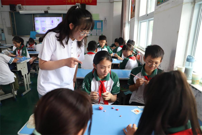 本次活動還精心設(shè)計(jì)了愛國主義教育、文化宣傳、思想引領(lǐng)、人文歷史、生物科學(xué)、素質(zhì)提升等多個領(lǐng)域的課程,旨在通過多樣化的教學(xué)內(nèi)容,激發(fā)孩子們的學(xué)習(xí)興趣,拓寬視野,播撒愛與希望的陽光。在多彩課堂上,志愿者以情景劇的形式對中醫(yī)藥文化進(jìn)行了普及和宣傳;用生動有趣的手勢舞讓同學(xué)們感受到漢字的韻律美、結(jié)構(gòu)美以及中華文化的博大精深;以生動的英語動畫和兒歌激發(fā)同學(xué)們對英語的學(xué)習(xí)興趣;“心靈折翼”折紙課、“黏土手作”手工課、“七彩童年”扎染課等豐富多彩的素質(zhì)提升課程鍛煉同學(xué)們的動手能力,展現(xiàn)了他們的創(chuàng)造力和奇思妙想。