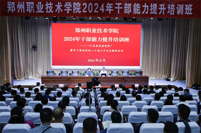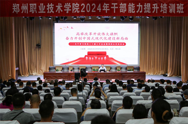 中新河南網(wǎng)8月26日電 為深入學(xué)習(xí)宣傳貫徹黨的二十屆三中全會(huì)精神,全面提升黨員干部履職能力,進(jìn)一步推動(dòng)學(xué)校各項(xiàng)工作高質(zhì)量發(fā)展,8月25日上午,鄭州職業(yè)技術(shù)學(xué)院2024年干部能力提升培訓(xùn)班暨學(xué)習(xí)貫徹黨的二十屆三中全會(huì)精神、“萬(wàn)名黨員進(jìn)黨校”“萬(wàn)名支部書(shū)記大輪訓(xùn)”培訓(xùn)班順利開(kāi)班。黨委書(shū)記呂村,黨委副書(shū)記、校長(zhǎng)潘維成,黨委班子成員肖世才、張建偉、王桂麗、王少華、楊挺,黨委委員梁玉欣、張為民,學(xué)校全體副科級(jí)以上干部、各基層黨組織委員、全體思政課教師共計(jì)200余人參加學(xué)習(xí)培訓(xùn)。開(kāi)班儀式由黨委書(shū)記呂村主持。