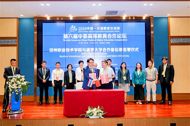 8月23日,主題為“深化大學(xué)高質(zhì)量合作,攜手培養(yǎng)國際化人才”第六屆中泰高等教育合作論壇”在貴安新區(qū)的中國—東盟教育交流周永久會(huì)址二樓斗篷山廳召開。本次論壇由江蘇大學(xué)、貴州大學(xué)、貴陽學(xué)院、東西方國際教育與中泰高等教育合作聯(lián)盟聯(lián)合主辦,吸引了來自中泰兩國20余所知名學(xué)府的80多位代表齊聚一堂。汝州職業(yè)技術(shù)學(xué)院劉延賓與泰國暹羅大學(xué)校長蓬猜博士共同簽署“MOU合作備忘錄”。