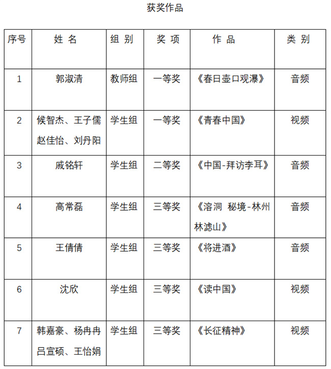 此項活動是河南測繪職業(yè)學(xué)院“4.23”讀書月重點工作,也是該校圖書館連續(xù)五屆承辦該活動校賽,經(jīng)過精心組織,多渠道廣泛宣傳,在師生中引起熱烈反響,校賽中遴選的優(yōu)秀作品在省賽中均斬獲佳績,再創(chuàng)歷史新高。其中,郭淑清音頻作品《春日壺口觀瀑》喜獲教師組一等獎,候智杰、王子儒、趙佳怡、劉丹陽視頻作品《青春中國》喜獲學(xué)生組一等獎。這些成績的獲得不僅是對學(xué)校師生朗讀才華的肯定,也是對學(xué)校教育教學(xué)質(zhì)量和校園文化建設(shè)的認可。