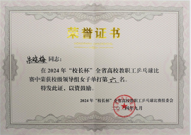 比賽中,朱曉梅穩(wěn)扎穩(wěn)打、連續(xù)作戰(zhàn)、靈活多變,最終取得校級領(lǐng)導(dǎo)組女子單打第六名好成績。5名參賽運動員團(tuán)結(jié)協(xié)作、奮力拼搏,不畏強(qiáng)手、敢打敢拼,杜春茂、門夢琪帶病堅持比賽,展現(xiàn)出了以球制勝、一“乒”到底的精神風(fēng)貌和運動風(fēng)采,充分詮釋了學(xué)校干部職工積極進(jìn)取、健康向上的良好精神風(fēng)貌,學(xué)校代表隊榮獲混合團(tuán)體比賽三等獎、優(yōu)秀組織獎。
