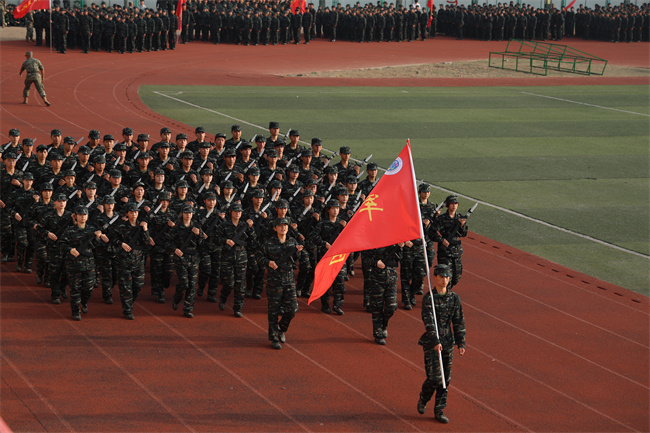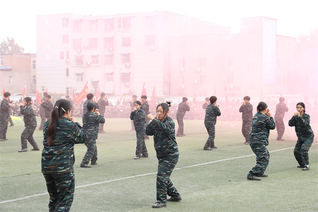 在激昂豪邁的軍樂(lè)聲中,51個(gè)軍訓(xùn)連隊(duì)精神抖擻、步履鏗鏘,依次通過(guò)主席臺(tái)接受檢閱,部分新生還進(jìn)行了擒敵拳、匕首操、刺殺操、戰(zhàn)術(shù)表演等軍事成果匯報(bào)。