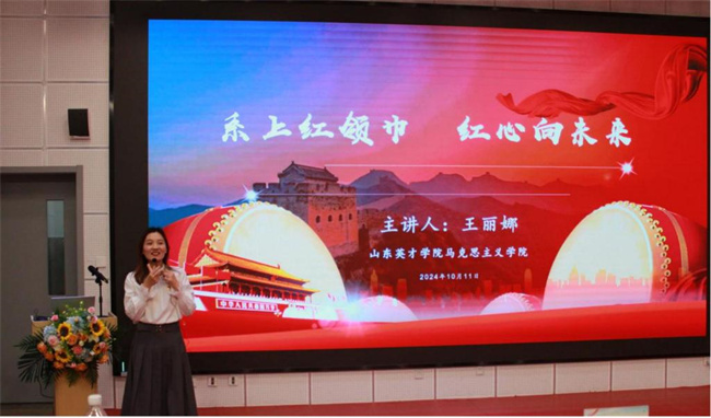 最后,山東英才學(xué)院馬克思主義學(xué)院青年教師王麗娜以“系上紅領(lǐng)巾,紅心向未來”為主題,為與會師生帶來了一場精彩的思政課。課程通過紅領(lǐng)巾的形狀、顏色及其背后的英雄故事,讓學(xué)生領(lǐng)悟公平與平等的核心價值,深切感受到革命先烈們用鮮血和生命所鑄就的輝煌歷史。課程高潮部分,以一首源自戍邊戰(zhàn)士陳祥榕的愛國旋律,將清澈的愛化為堅定的信念,激發(fā)同學(xué)們將愛國情懷轉(zhuǎn)化為實際行動,為實現(xiàn)中國夢貢獻(xiàn)力量。