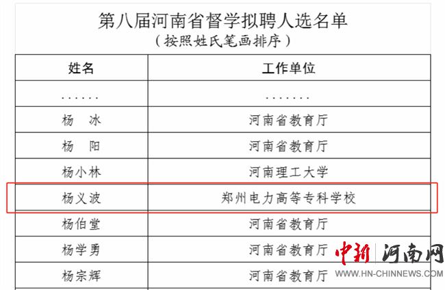 中新河南網(wǎng)11月9日電(姚夢(mèng)偉) 日前,河南省教育廳公布了第八屆河南省督學(xué)擬聘人選名單,鄭州電力高等專科學(xué)校黨委書記楊義波教授名列其中。