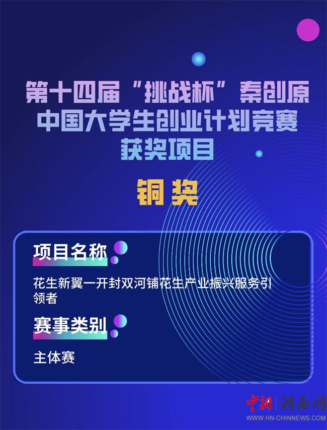 據(jù)悉,第十四屆“挑戰(zhàn)杯”秦創(chuàng)原中國大學生創(chuàng)業(yè)計劃競賽由共青團中央、教育部、人力資源社會保障部、中國科協(xié)、全國學聯(lián)、陜西省人民政府聯(lián)合主辦,由西安交通大學、共青團陜西省委承辦共吸引來自2700余所高校的300多萬名學生參與,累計提交39萬余個創(chuàng)新創(chuàng)業(yè)項目。開封文化藝術(shù)職業(yè)學院《花生新翼——開封雙河鋪花生產(chǎn)業(yè)振興服務(wù)引領(lǐng)者》項目突出重圍,入圍全國決賽并斬獲銅獎。
