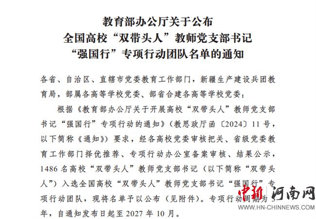 據(jù)悉,此次高校“雙帶頭人”教師黨支部書記“強國行”專項行動,經(jīng)基層黨組織申報、學(xué)校黨委審核把關(guān)、省級黨委教育工作部門擇優(yōu)推薦、專項行動辦公室備案審核,共遴選產(chǎn)生1486個高校“雙帶頭人”教師黨支部書記“強國行”專項行動團隊,旨在創(chuàng)新落實立德樹人根本任務(wù),深入貫徹落實教育部黨組關(guān)于高校“雙帶頭人”教師黨支部書記培育工作的部署要求,引導(dǎo)廣大師生在以中國式現(xiàn)代化全面推進強國建設(shè)、民族復(fù)興偉業(yè)新征程上砥礪新?lián)?dāng)、展現(xiàn)新作為。(黃河水利職業(yè)技術(shù)學(xué)院供稿)