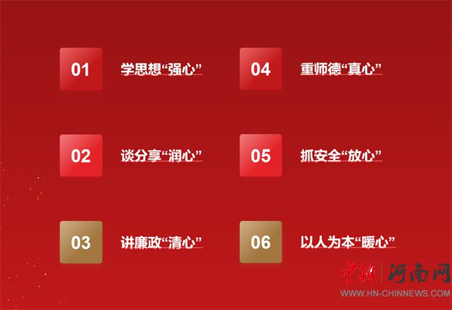 新鄉(xiāng)職業(yè)技術(shù)學(xué)院將對(duì)教育的博愛(ài)化成“六心”工程。即學(xué)思想“強(qiáng)心”、談分享“潤(rùn)心”、講廉政“清心”、重師德“真心”、抓安全“放心”、以人為本“暖心”。在教師隊(duì)伍建設(shè)中,學(xué)校深度融入“六心”工程于日常。以強(qiáng)心堅(jiān)守教育信念,以潤(rùn)心關(guān)愛(ài)學(xué)生成長(zhǎng),以清心恪守師德規(guī)范,以真心永葆師德師風(fēng),以安心抓好校園安全,以暖心鑄就教育輝煌,大思政氛圍漸濃,育人無(wú)聲。
