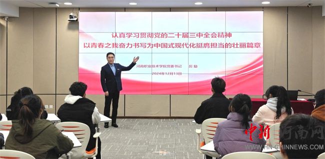 中新河南網(wǎng)12月16日電(谷世飛) 12月13日上午,河南職業(yè)技術(shù)學(xué)院黨委書記厲勵(lì)以“認(rèn)真學(xué)習(xí)貫徹黨的二十屆三中全會精神,以青春之我奮力書寫為中國式現(xiàn)代化挺膺擔(dān)當(dāng)?shù)膲邀惼?rdquo;為題,為智能制造學(xué)院2024級數(shù)控技術(shù)專業(yè)的同學(xué)們講授了一堂既有思想性、理論性又充滿啟發(fā)性、親和力的生動思政課。