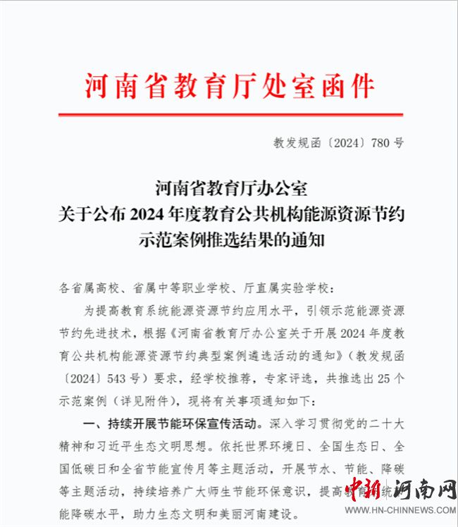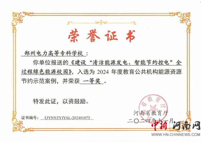 中新河南網(wǎng)12月17日電(張思雨) 在河南省2024年度教育公共機構(gòu)能源節(jié)約典型案例遴選活動中,鄭州電力高等?茖W(xué)校總結(jié)近年來綠色能源建設(shè)和能源資源節(jié)約工作開展情況,推薦報送《建設(shè)“清潔能源發(fā)電、智能節(jié)約控電”全過程綠色能源校園》典型案例,榮獲河南省2024年度教育公共機構(gòu)能源資源節(jié)約示范案例一等獎,全省一等獎共10名,鄭州電力高等?茖W(xué)校為唯一高職高專類獲評院校。