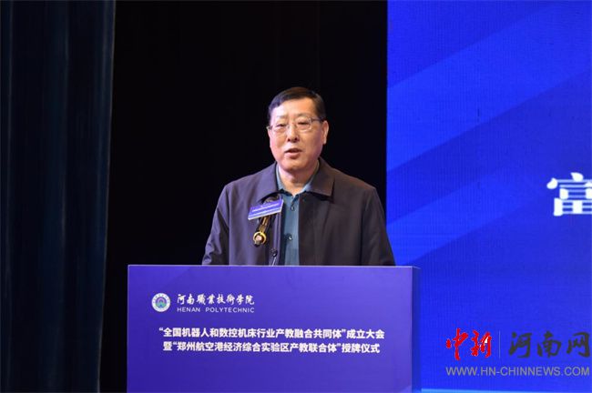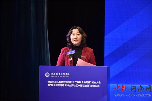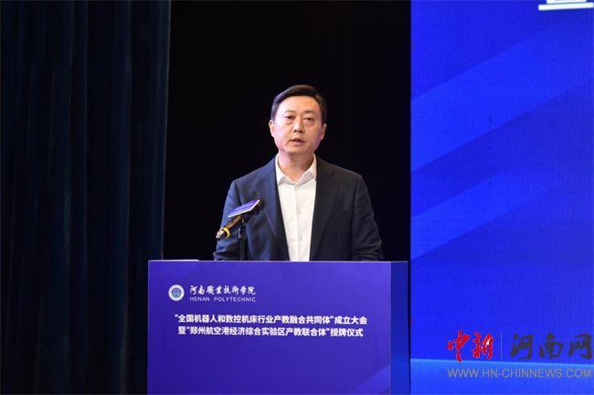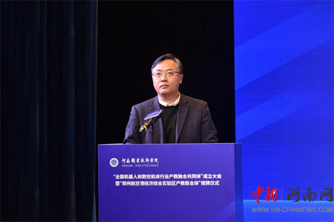 中新河南網(wǎng)12月21日電(鄧會敏) 12月19日上午,全國機(jī)器人和數(shù)控機(jī)床行業(yè)產(chǎn)教融合共同體成立大會暨鄭州航空港經(jīng)濟(jì)綜合實驗區(qū)產(chǎn)教聯(lián)合體授牌儀式在河南職業(yè)技術(shù)學(xué)院(以下簡稱該校)舉行。河南省教育廳黨組成員、副廳長張國強(qiáng),河南省工業(yè)和信息化廳黨組成員、副廳長孫永民,機(jī)械工業(yè)教育發(fā)展中心主任陳曉明,鄭州大學(xué)黨委常委、副校長胡少偉,珠海格力智能裝備技術(shù)研究院有限公司副總經(jīng)理陳威,富士康科技集團(tuán)富聯(lián)裕展科技(河南)有限公司副總經(jīng)理張占武,鄭州航空港經(jīng)濟(jì)綜合實驗區(qū)教育衛(wèi)生體育局副局長郭帥,河南省機(jī)器人與數(shù)控機(jī)床行業(yè)協(xié)會會長王濟(jì)昌等出席會議。該校黨委書記厲勵,黨委副書記、校長夏新顏等校領(lǐng)導(dǎo)班子成員,以及共同體、聯(lián)合體會員單位領(lǐng)導(dǎo)和代表近200人參加大會。大會分別由夏新顏和校黨委委員、副校長肖瓏主持。