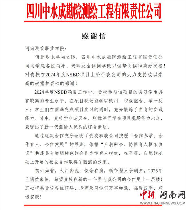 中新河南網(wǎng)12月23日電(季德閣) 近日,河南測繪職業(yè)學(xué)院收到了來自四川中水成勘院測繪工程有限責(zé)任公司的感謝信,對河南測繪職業(yè)學(xué)院在2024年度南水北調(diào)一、二等水準(zhǔn)測量項(xiàng)目中給予的大力支持和學(xué)生的出色表現(xiàn)表示了崇高的敬意和衷心的感謝。