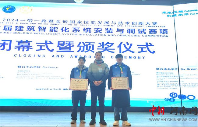 中新河南網(wǎng)12月24日電(馬青松) 12月18日至22日,2024“一帶一路”暨金磚國家技能發(fā)展與技術(shù)創(chuàng)新大賽首屆建筑智能化安裝與調(diào)試賽項(xiàng)在郴州職業(yè)技術(shù)學(xué)院落下帷幕。河南職業(yè)技術(shù)學(xué)院電子與物聯(lián)網(wǎng)學(xué)院學(xué)生喬梓豪、石昊冉組隊(duì)參賽,榮獲高職組三等獎(jiǎng)。