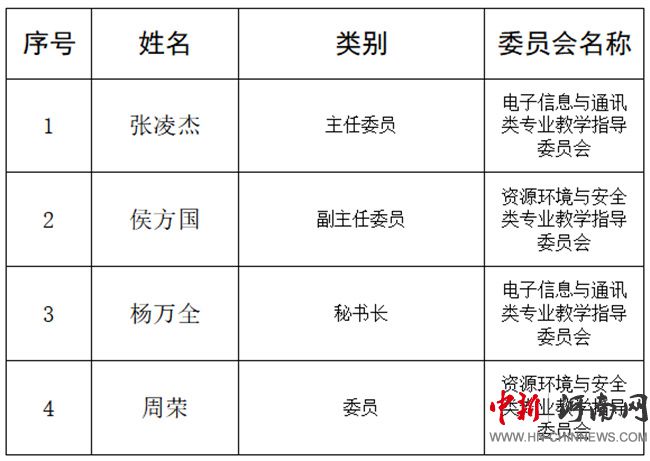 其中,校黨委副書記、校長張凌杰任電子信息與通訊類專業(yè)教學(xué)指導(dǎo)委員會(huì)主任委員;測繪技術(shù)產(chǎn)業(yè)學(xué)院院長侯方國任資源環(huán)境與安全類專業(yè)教學(xué)指導(dǎo)委員會(huì)副主任委員;信息中心副主任楊萬全任電子信息與通訊類專業(yè)教學(xué)指導(dǎo)委員會(huì)秘書長;測繪工程系副主任周榮任資源環(huán)境與安全類專業(yè)教學(xué)指導(dǎo)委員會(huì)委員。