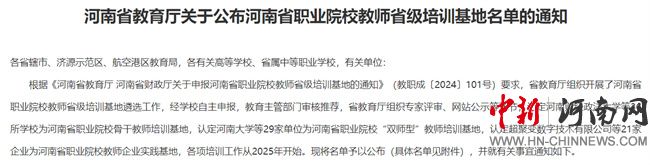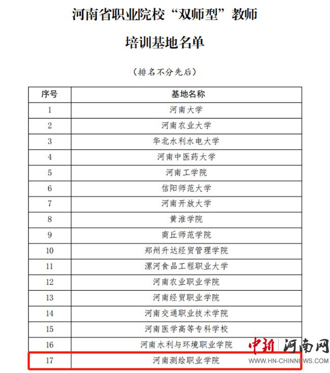 中新河南網(wǎng)12月26日電(王曉雯) 12月24日,河南省教育廳公布了《關于公布河南省職業(yè)院校教師省級培訓基地名單的通知》,河南測繪職業(yè)學院順利通過遴選,成功獲批為河南省職業(yè)院校“雙師型”教師培訓基地。
