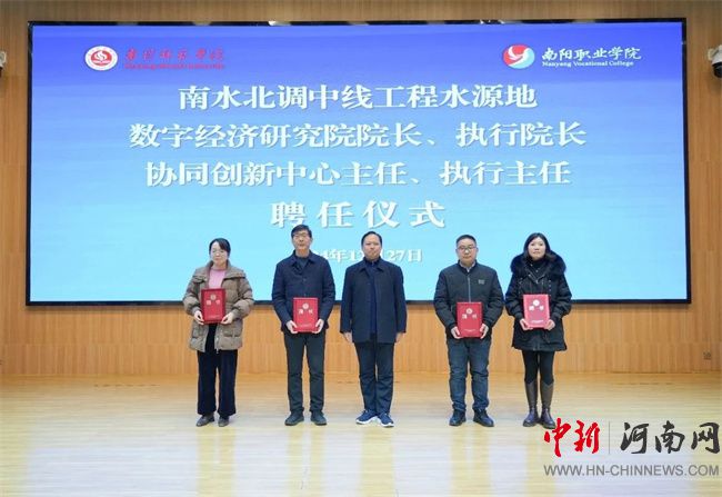 董聯(lián)軍代表學(xué)校正式聘任南陽師范學(xué)院經(jīng)濟(jì)與管理學(xué)院院長姜長寶為南水北調(diào)中線工程水源地數(shù)字經(jīng)濟(jì)研究院院長、南陽職業(yè)學(xué)院商學(xué)院院長余娟為執(zhí)行院長,南水北調(diào)中線水源區(qū)水安全協(xié)同創(chuàng)新中心主任何俊寶為協(xié)同創(chuàng)新中心主任、南陽職業(yè)學(xué)院發(fā)展規(guī)劃處處長萬樂為執(zhí)行主任。
