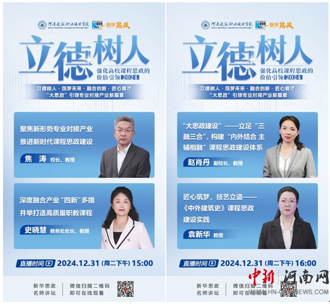 此次系列直播課,是學(xué)校貫徹落實(shí)立德樹(shù)人根本任務(wù),全面推進(jìn)課程思政建設(shè),充分展示學(xué)校課程思政建設(shè)成效,促進(jìn)課程思政建設(shè)經(jīng)驗(yàn)分享交流的重要舉措。系列直播課共有4場(chǎng),內(nèi)容以學(xué)校課程思政建設(shè)實(shí)踐為基礎(chǔ),以耕讀教育賦能課程思政為特色。校長(zhǎng)焦?jié)浴毒劢剐滦蝿?shì)專業(yè)對(duì)接產(chǎn)業(yè),推進(jìn)新時(shí)代課程思政建設(shè)》為主題分享了在專業(yè)建設(shè)過(guò)程中課程思政的全方位融入和建設(shè)經(jīng)驗(yàn)。副校長(zhǎng)趙肖丹以《河南建筑職業(yè)技術(shù)學(xué)院“大思政建設(shè)”——立足“三融三合”,構(gòu)建“內(nèi)外結(jié)合主輔相融”課程思政建設(shè)體系》為主題分享了學(xué)校課程思政建設(shè)的長(zhǎng)效機(jī)制。教務(wù)處處長(zhǎng)史曉慧、教授袁新華分別就相關(guān)主題展開(kāi)精彩分享。建設(shè)信息工程系張華英主任主持的省級(jí)課程思政示范課程《計(jì)算機(jī)網(wǎng)絡(luò)技術(shù)》正在新華網(wǎng)“新華思政”平臺(tái)展播,累計(jì)學(xué)習(xí)達(dá)1.3萬(wàn)人次。
