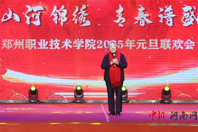 鄭州職業(yè)技術(shù)學(xué)院原副校長周慧玲在學(xué)校元旦聯(lián)歡會(huì)現(xiàn)場為全校師生送上祝福并表演詩朗誦《沁園春·長沙》