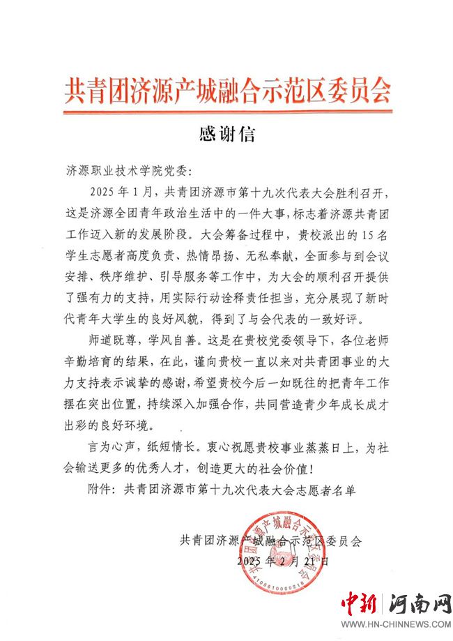 中新河南網(wǎng)2月26日電 近日,共青團(tuán)濟(jì)源產(chǎn)城融合示范區(qū)委員會(huì)向濟(jì)源職業(yè)技術(shù)學(xué)院發(fā)來感謝信,對濟(jì)源職業(yè)技術(shù)學(xué)院在2025年1月為共青團(tuán)濟(jì)源市第十九次代表大會(huì)提供的志愿服務(wù)工作表示誠摯感謝。