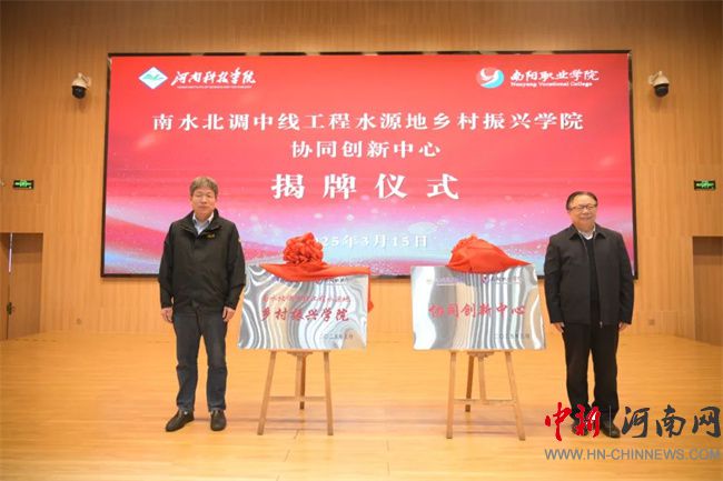 在眾人的共同見證下,河南科技學院校長闞云超與南陽職業(yè)學院校長郭建生代表雙方簽署《對口幫扶合作框架協(xié)議》。隨后,兩位校長共同為南水北調(diào)中線工程水源地鄉(xiāng)村振興學院和協(xié)同創(chuàng)新中心揭牌。