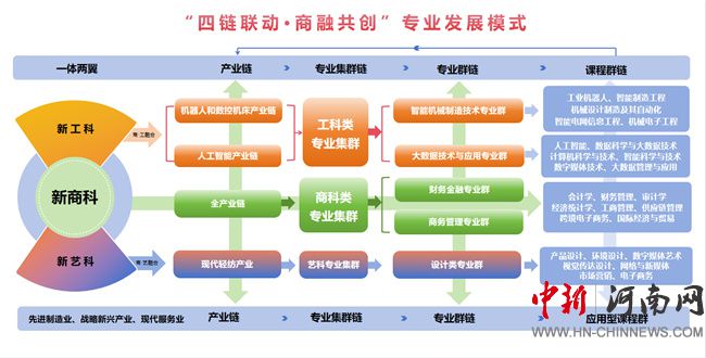 依托河南省和鄭州市重點產(chǎn)業(yè)鏈,面向先進制造業(yè)、戰(zhàn)略新興產(chǎn)業(yè)、現(xiàn)代服務業(yè)三大產(chǎn)業(yè),打造工科類、商科類、藝科類三大專業(yè)集群,形成與區(qū)域產(chǎn)業(yè)高度匹配的智能機械制造技術專業(yè)群、大數(shù)據(jù)技術與應用專業(yè)群、財務金融專業(yè)群、商務管理專業(yè)群、設計類專業(yè)群六大專業(yè)群。