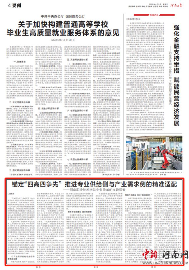 中新河南網(wǎng)4月9日電(夏新顏) 河南職業(yè)技術(shù)學(xué)院主動聚焦國家和我省重大戰(zhàn)略需求,積極融入?yún)^(qū)域經(jīng)濟(jì)社會發(fā)展,以學(xué)科專業(yè)優(yōu)化為突破口,促進(jìn)高等教育與經(jīng)濟(jì)社會發(fā)展同頻共振,以更加有為的精神狀態(tài)履職盡責(zé)、拼搶進(jìn)位,為高質(zhì)量發(fā)展貢獻(xiàn)力量。