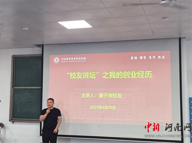 中新河南網(wǎng)5月5日電(文·圖/王輝) 4月29日,河南醫(yī)學(xué)高等專(zhuān)科學(xué)校第一期“校友講壇”活動(dòng)成功舉辦,2020屆護(hù)理專(zhuān)業(yè)校友、河南省一專(zhuān)健康管理集團(tuán)董事長(zhǎng)、河南產(chǎn)學(xué)研母嬰研究院院長(zhǎng)康子坤作《從醫(yī)專(zhuān)人到創(chuàng)業(yè)人的蛻變-創(chuàng)業(yè)經(jīng)歷分享》主題講座。學(xué)校大學(xué)生就業(yè)創(chuàng)業(yè)指導(dǎo)中心、公共基礎(chǔ)部有關(guān)人員和學(xué)生代表100余人參加。