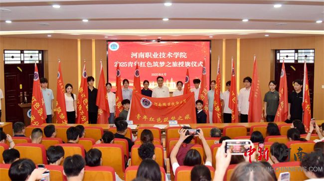 中新河南網(wǎng)6月22日電(尹霞) 6月19日上午,河南職業(yè)技術(shù)學(xué)院2025年“青年紅色筑夢之旅”活動(dòng)授旗儀式在勤業(yè)樓239會議室舉行。校黨委書記厲勵(lì)為紅旅分隊(duì)授旗并作動(dòng)員講話。校黨委委員、副校長任楓軒出席儀式。各二級學(xué)院黨總支書記、副書記、雙創(chuàng)專干以及13支紅旅分隊(duì)師生共計(jì)140余人參加活動(dòng)。
