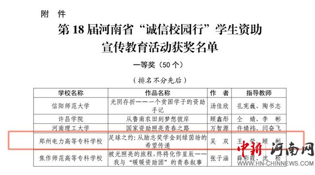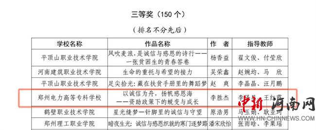 近年來(lái),鄭州電力高等?茖W(xué)校全面落實(shí)立德樹(shù)人根本任務(wù),將資助與育人緊密結(jié)合,通過(guò)政策宣傳、誠(chéng)信教育、感恩勵(lì)志等活動(dòng),著力培養(yǎng)學(xué)生的誠(chéng)信品質(zhì)、感恩意識(shí)與社會(huì)責(zé)任感。此次獲獎(jiǎng)?wù)蔑@了鄭州電力高等?茖W(xué)校資助育人工作的扎實(shí)成效與學(xué)生綜合素質(zhì)的持續(xù)提升。