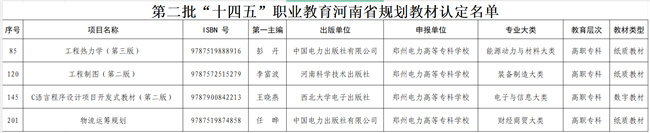 中新河南網(wǎng)7月17日電(曹瑞華) 近期,河南省教育廳公布第二批“十四五”職業(yè)教育河南省規(guī)劃教材書目,鄭州電力高等專科學(xué)!豆こ虩崃W(xué)》等4部教材(紙質(zhì)教材3部、數(shù)字教材1部)入選第二批“十四五”職業(yè)教育河南省規(guī)劃教材。