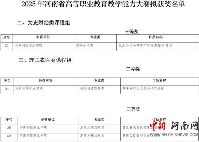 中新河南網(wǎng)7月24日電(文/陳賀) 近日,河南省教育廳公布 2025 年河南省高等職業(yè)教育教學(xué)能力大賽擬獲獎名單。河南測繪職業(yè)學(xué)院報送的4個參賽作品均斬獲佳績,喜得二等獎1項、三等獎3項,在該項賽事中實現(xiàn)新的突破。