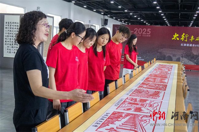 文化站負(fù)責(zé)人為實(shí)踐團(tuán)講解“紅旗渠十大工程”剪紙作品