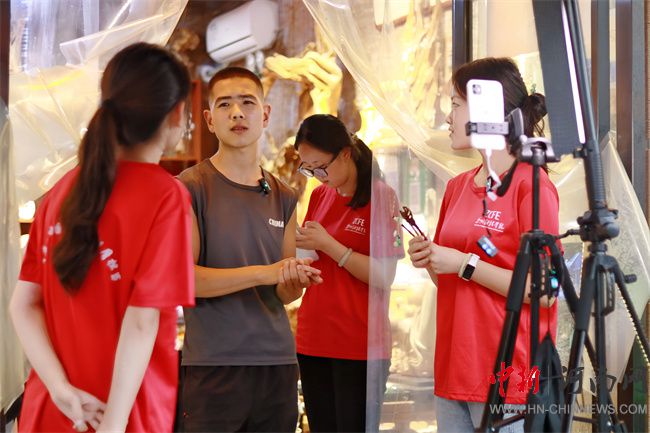 實(shí)踐團(tuán)成員協(xié)助石板巖小鎮(zhèn)“聚緣根藝”根雕店鋪開展直播