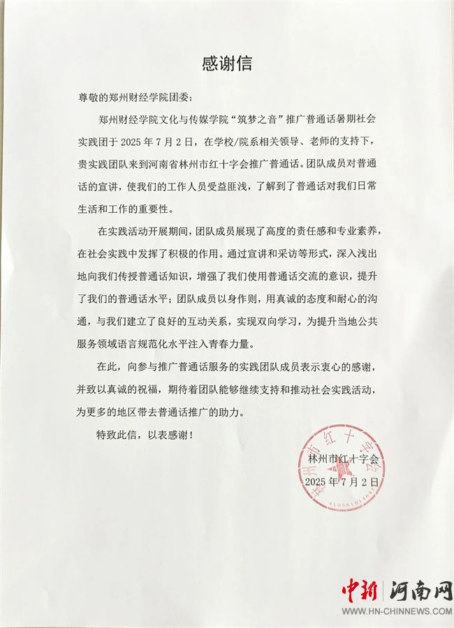 活動(dòng)結(jié)束后,實(shí)踐團(tuán)積極擴(kuò)大活動(dòng)影響力,在中國(guó)青年網(wǎng)、大象新聞、網(wǎng)易新聞等平臺(tái)積極投稿;林州市博物館公眾號(hào)發(fā)布專題推文進(jìn)行報(bào)道;團(tuán)隊(duì)在抖音發(fā)布的活動(dòng)視頻收獲超十萬(wàn)點(diǎn)贊,贏得廣大網(wǎng)友支持與贊賞,并獲共青團(tuán)河南省委官方抖音賬號(hào)、中國(guó)青年報(bào)客戶端官方賬號(hào)轉(zhuǎn)發(fā)推廣,使“推普助農(nóng)”之聲傳得更遠(yuǎn)。林州市紅十字會(huì)、林州市氣象臺(tái)紛紛發(fā)來(lái)感謝信,對(duì)實(shí)踐團(tuán)的出色表現(xiàn)與積極貢獻(xiàn)表示高度贊揚(yáng)與衷心感謝。