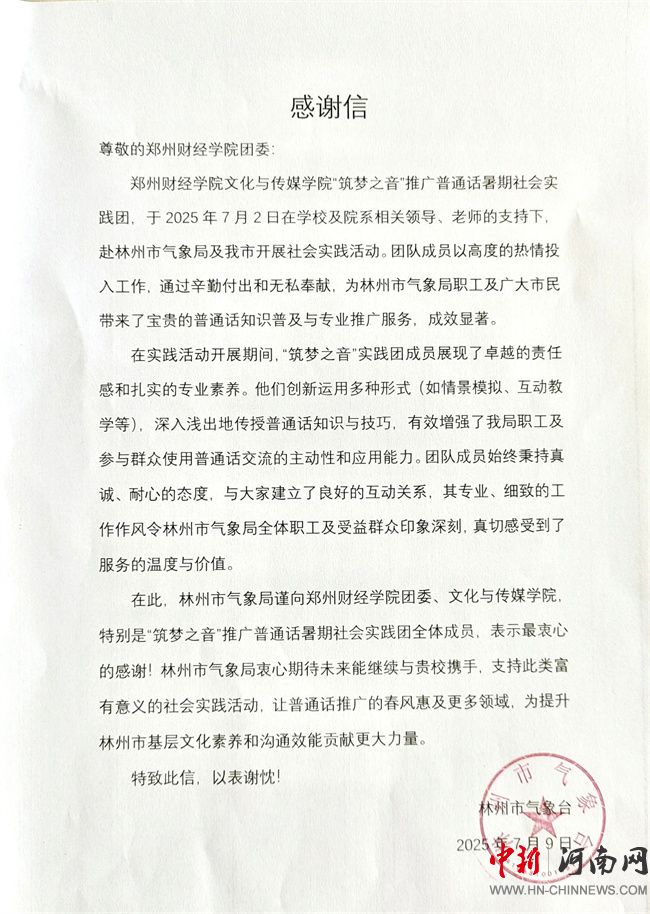 林州市氣象臺(tái)發(fā)來(lái)的感謝信