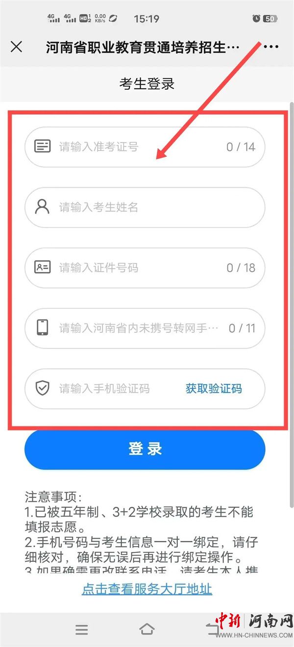 1.考生進(jìn)入“河南省職業(yè)教育貫通培養(yǎng)招生服務(wù)平臺(tái)”,點(diǎn)擊頁(yè)面下方的“考生登錄”按鈕;進(jìn)入頁(yè)面之后填寫考生的“準(zhǔn)考證號(hào)、姓名、身份證號(hào)、手機(jī)號(hào)(河南號(hào)碼)”,并輸入手機(jī)驗(yàn)證碼進(jìn)行登錄。如下圖: