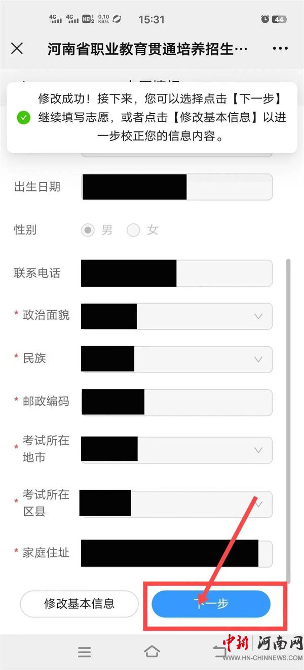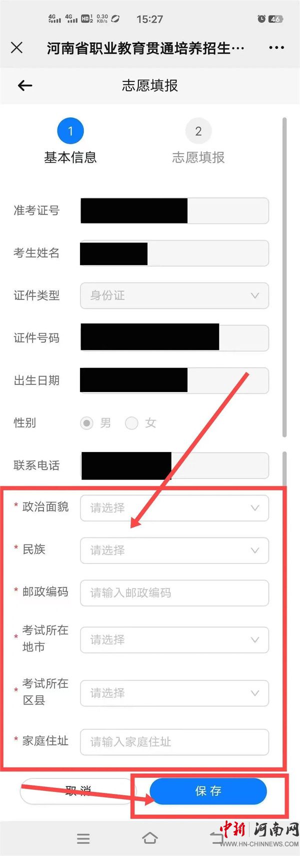 3.進(jìn)入“志愿填報(bào)”頁(yè)面之后,填寫考生的“政治面貌、民族、郵政編碼、考試所在地市、考試所在區(qū)縣、家庭住址”,然后點(diǎn)擊“保存”按鈕,接下來(lái)點(diǎn)擊“下一步”按鈕,進(jìn)行志愿填報(bào)。如下圖: