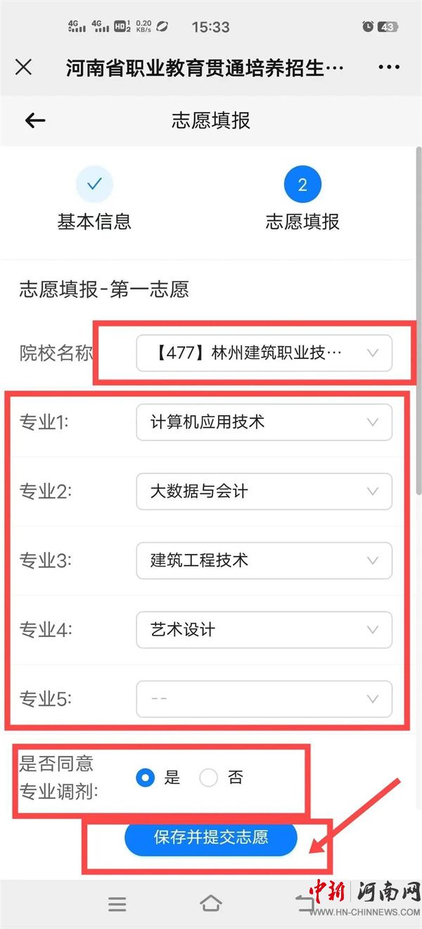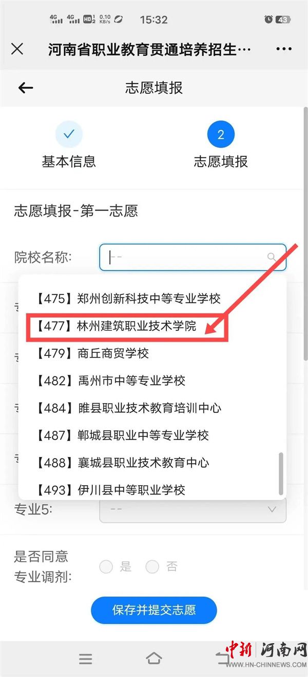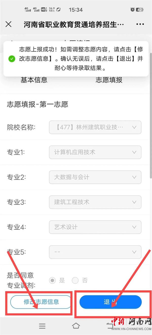 4.考生可填報(bào)兩個(gè)志愿,實(shí)行順序志愿投檔,每個(gè)志愿填報(bào)1所院校,每所院校填報(bào)1至5個(gè)專業(yè),并需確認(rèn)是否同意所報(bào)院校專業(yè)間調(diào)劑(填報(bào)學(xué)校志愿的考生,搜索院校名稱“【477】林州建筑職業(yè)技術(shù)學(xué)院”),然后點(diǎn)擊“保存并提交志愿”按鈕,最后系統(tǒng)顯示志愿上報(bào)成功。如需調(diào)整志愿內(nèi)容,請(qǐng)點(diǎn)擊“修改志愿信息”。確認(rèn)無(wú)誤后,請(qǐng)點(diǎn)擊【退出】并耐心等待錄取結(jié)果。如下圖: